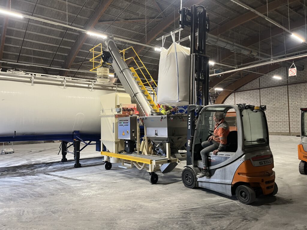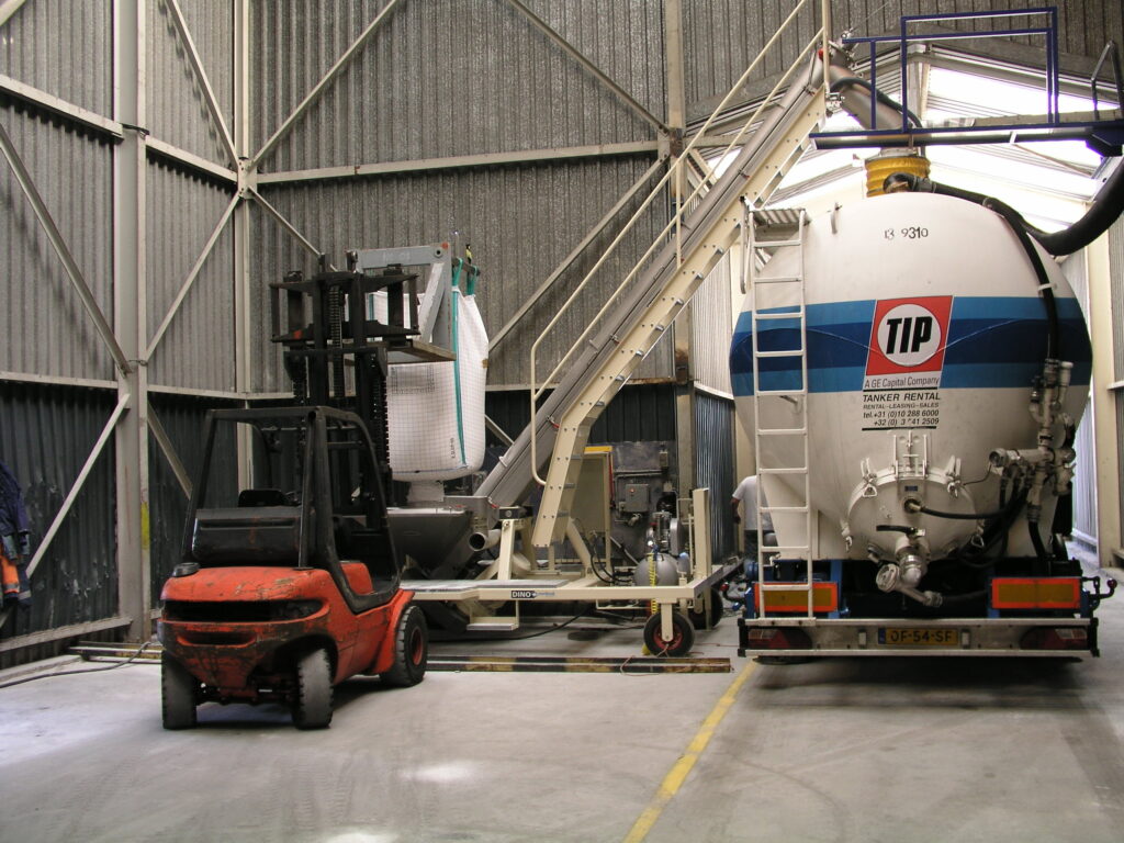 Met een Dino bulkwagenvuller kunt u producten verpakt in big bags en/of losgestorte bulkgoederen zoals natriumchloride, citroenzuur, natriumbicarbonaat, sodium bicarbonaat, citraten, zouten en meststoffen geautomatiseerd en stofarm verladen naar bulkwagens, ook wel silowagens genoemd. Naast de intake van big bags en los gestorte bulkgoederen, is het ook mogelijk om octabins, (25kg)zakgoed en containers met inner liner te storten in de Dino bulkwagenvuller of gebruik te maken van een shovel, ook wel front loader of bobcat genoemd.
