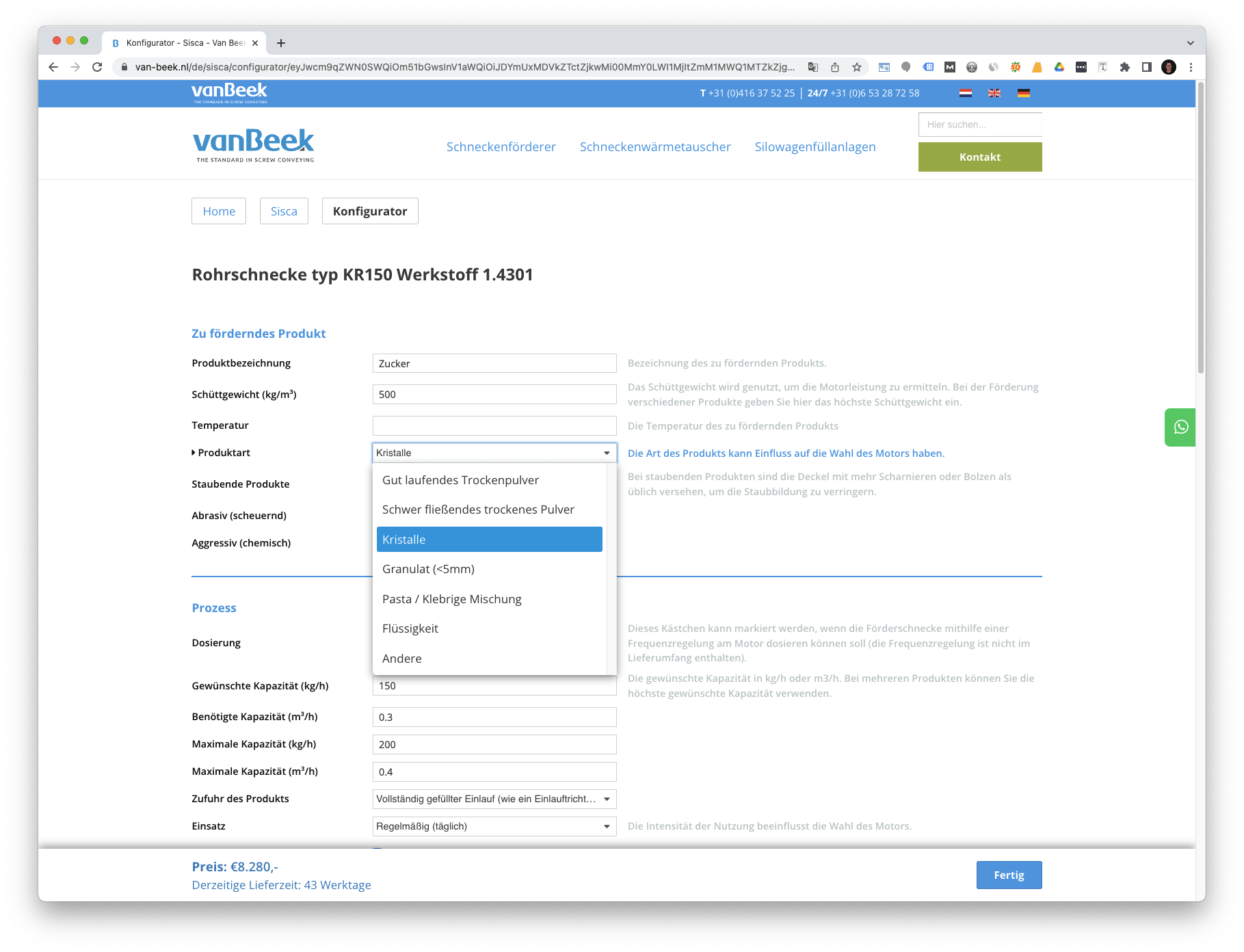 „Sie erfahren sofort Angaben zu Lieferzeit und Preis, denn ich kalkuliere in Echtzeit. Auf Knopfdruck erstelle ich Ihnen aufgrund der Kalkulation Ihres Rohr-, Trog- oder Omegatrogförderers ein Angebot. Ich bemühe mich, Ihnen das Angebot einschließlich des 3D-Entwurfs innerhalb von 1 Stunde per E-Mail zukommen zu lassen. Einverstanden? Ich sorge für eine schnelle Lieferung ab 4 Wochen. Mit der über 80-jährigen Erfahrung von Van Beek sorge ich für Qualität, Service sowie Zeit- und Kostenersparnis. Legen Sie los, ich helfe Ihnen gerne!“