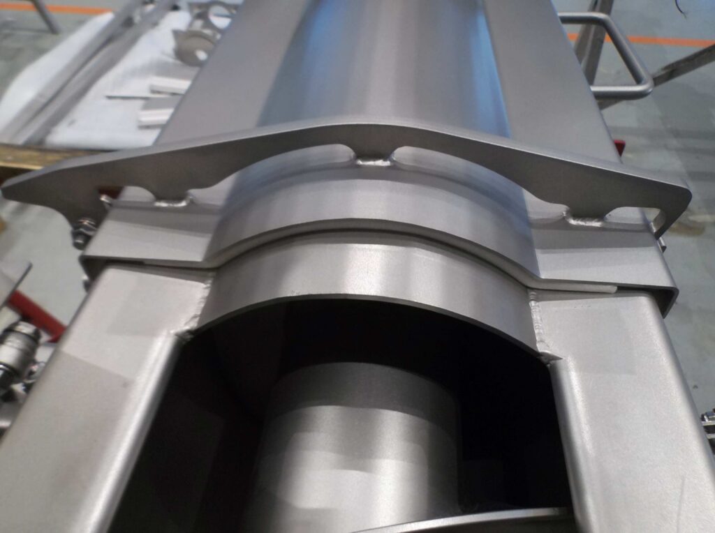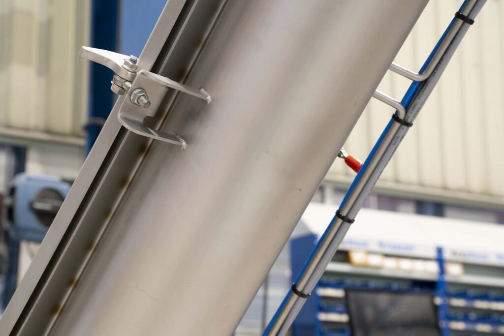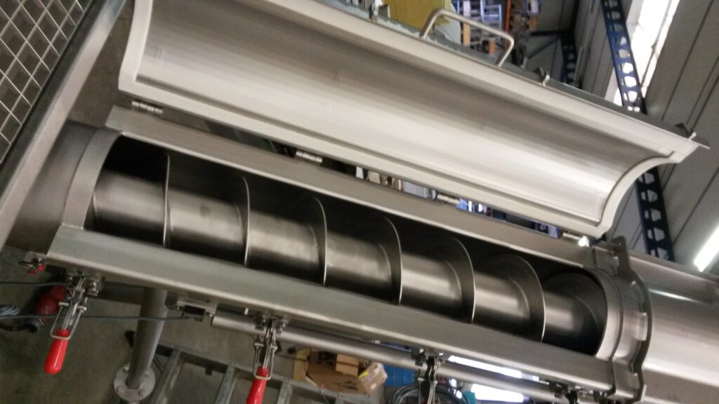 Omega-Steigschnecken ermöglichen einen schnellen Produktwechsel ohne Kontaminationsrisiko. Der Vorteil dieses Steigschnecken-Systems sind die hochklappbaren Deckel, wodurch die Anlage sich leicht reinigen und inspizieren lässt. Diese Omega-Steigschnecken werden häufig eingesetzt, um ein Produkt zu einem höher gelegenen Schüttpunkt zu befördern.