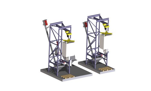 The installation consists of two set-ups in which the big bag is hoisted up and connected dust-free to the feed tank of the screw elevator. The sugar discharged from big bags into the screw elevator is lifted by a screw in the screw elevator to a sugar storage tank. One of the two screw elevators is fitted with an extra inlet, to which a dosing screw is connected, so that via this inlet glucose can be added to the main stream of sugar in the required ratio.