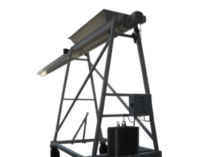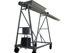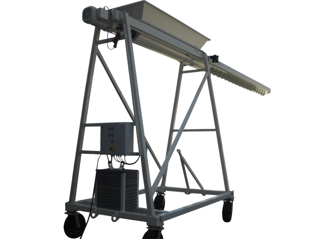 The liner filler is a horizontally mounted screw conveyor which allows 20ft containers to be filled with granulates (plastic granules), powders (such as flour) and flakes. The screw is fed from an inlet hopper mounted either above or via an opening. The hopper can be filled from a silo, a Dino bulk truck loader, with bags or a with shovel.