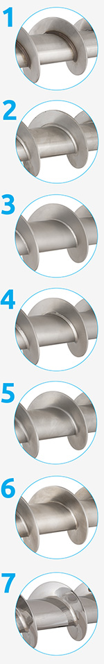 Daar waar de productie van gewalste schroeven als iets puur mechanisch kan worden gezien, bestaat de productie van uit bladen opgebouwde schroeven voor 90 procent uit handwerk. Doordat de schroefbladen van deze uitvoering uit plaatmateriaal worden gesneden en vervolgens door een hydraulische pers op de juiste spoed (pitch) worden geperst, ontstaat er na bevestiging op de schroefbuis een gladde oppervlakte. In het geval van uitvoering 7 is er zelfs sprake van een hoogglans gepolijste schroef, die producten op gestroomlijnde wijze transporteert. Deze hoge kwaliteit zorgt meteen ook voor misvattingen. Anders dan je misschien zou denken, is dit glanspareltje niet per se geschikt voor het transporteren van alle producten. “Klanten denken vaak ‘hoe gladder de schroef is, hoe beter’, maar het tegendeel is waar. Het gladde oppervlak kan er namelijk voor zorgen, dat een product aan de schroef blijft kleven. Een wat grovere schroef is in sommige gevallen beter om aankleving te voorkomen”, stelt Eric de Jong, Manager Operations bij Van Beek.